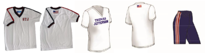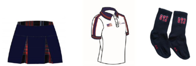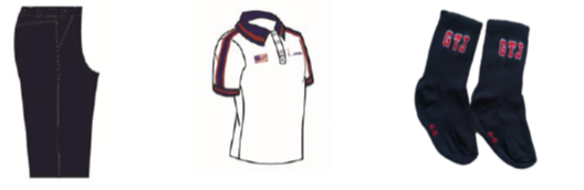 - Camibuso blanco de cuello azul con ribete rojo y logotipo Gimnasio Thomas Jefferson y bandera institución bordados (imagen).